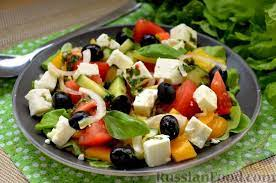 Классика греческой кухни: свежий овощной салат из помидоров, огурцов и болгарского перца со сладким луком. Подаётся с сыром фета.