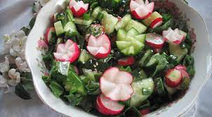 Овощной салат из хрустящей пекинской капусты, огурца и редиски. Тонкие вкусовые акценты салат приобретает благодаря заправке из настоянного на свежем базилике масла.